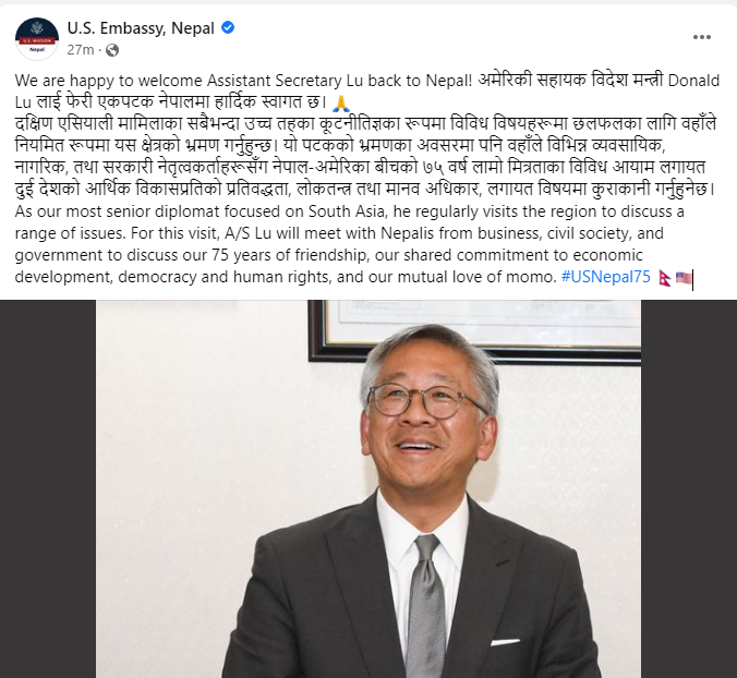 Informing about the arrival of Lu, the US Embassy said on its Facebook page that Assistant Secretary Lu will hold meetings with the business community, civil society, and government officials during his stay in Nepal.