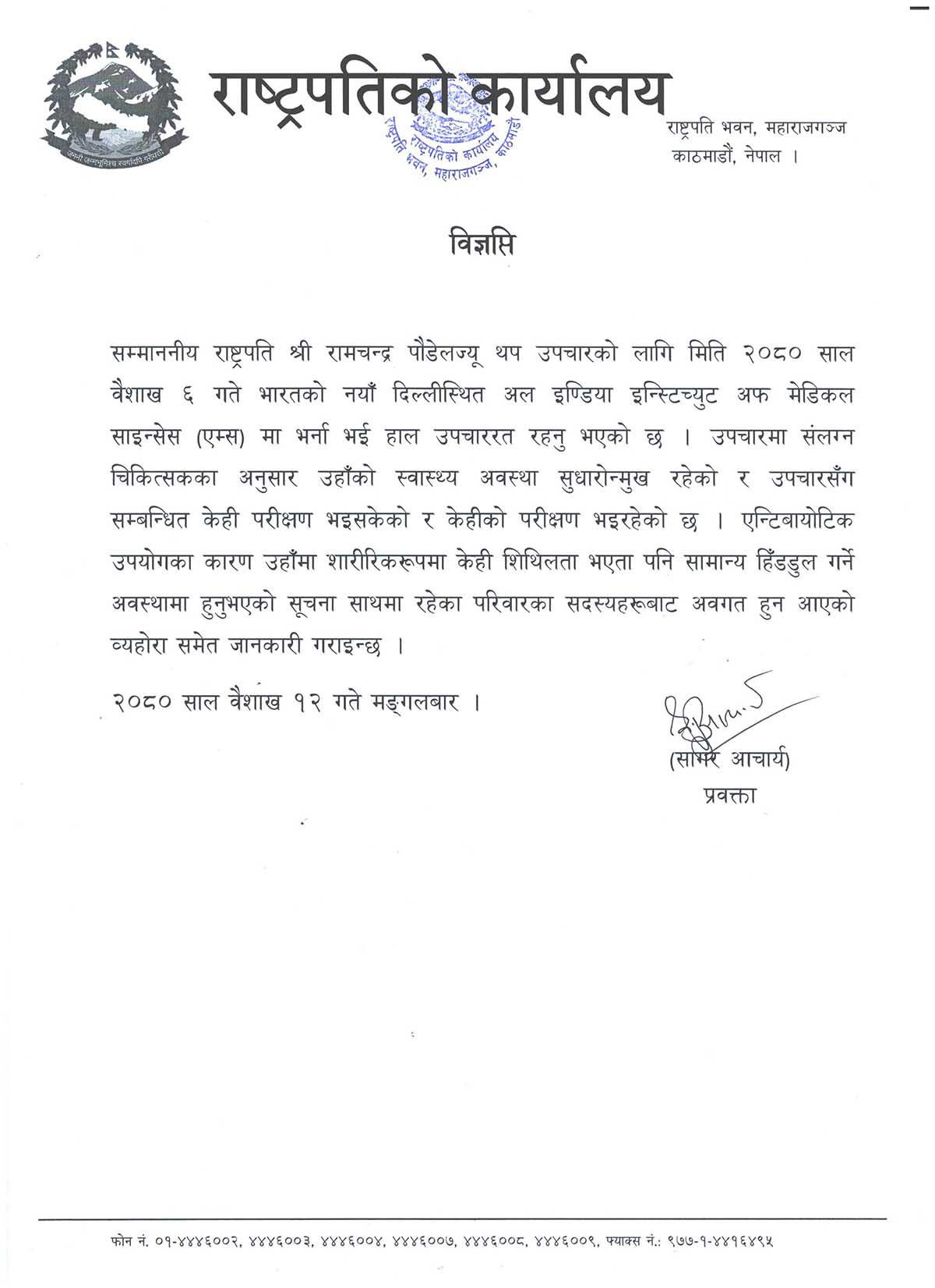 Issuing a press release on Tuesday, Sagar Acharya, Spokesperson at the President’s Office, informed that the health of the President is improving.