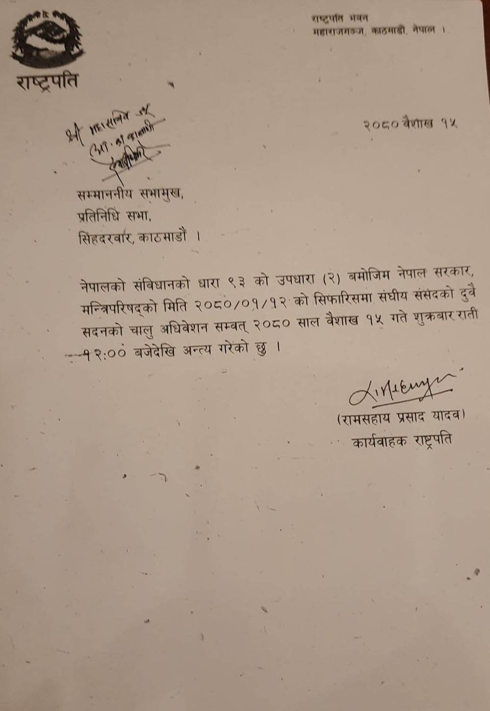 Issuing a press release President's Office has stated that a cabinet meeting held on Tuesday had recommended acting president Yadav end both parliament sessions from Friday midnight.