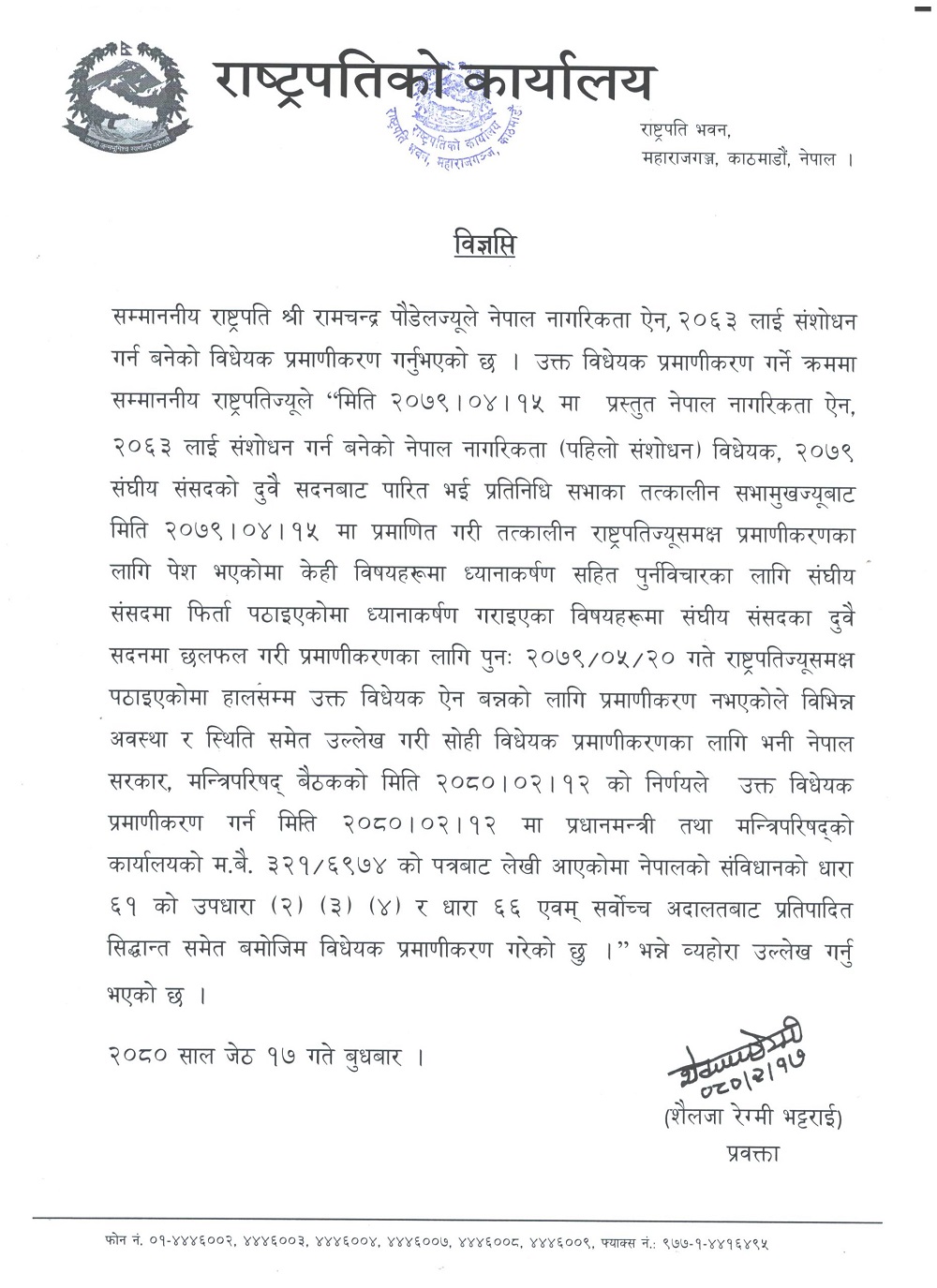 President Office's spokesperson Shailaja Regmi Bhattarai has said that President Paudel authenticated the citizenship bill on Wednesday.