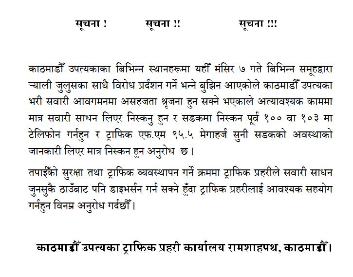 It is mentioned in the message of the Kathmandu Valley Traffic Police Office that the demonstration is likely to cause a hurdle in transportation mobility in the Kathmandu Valley.
