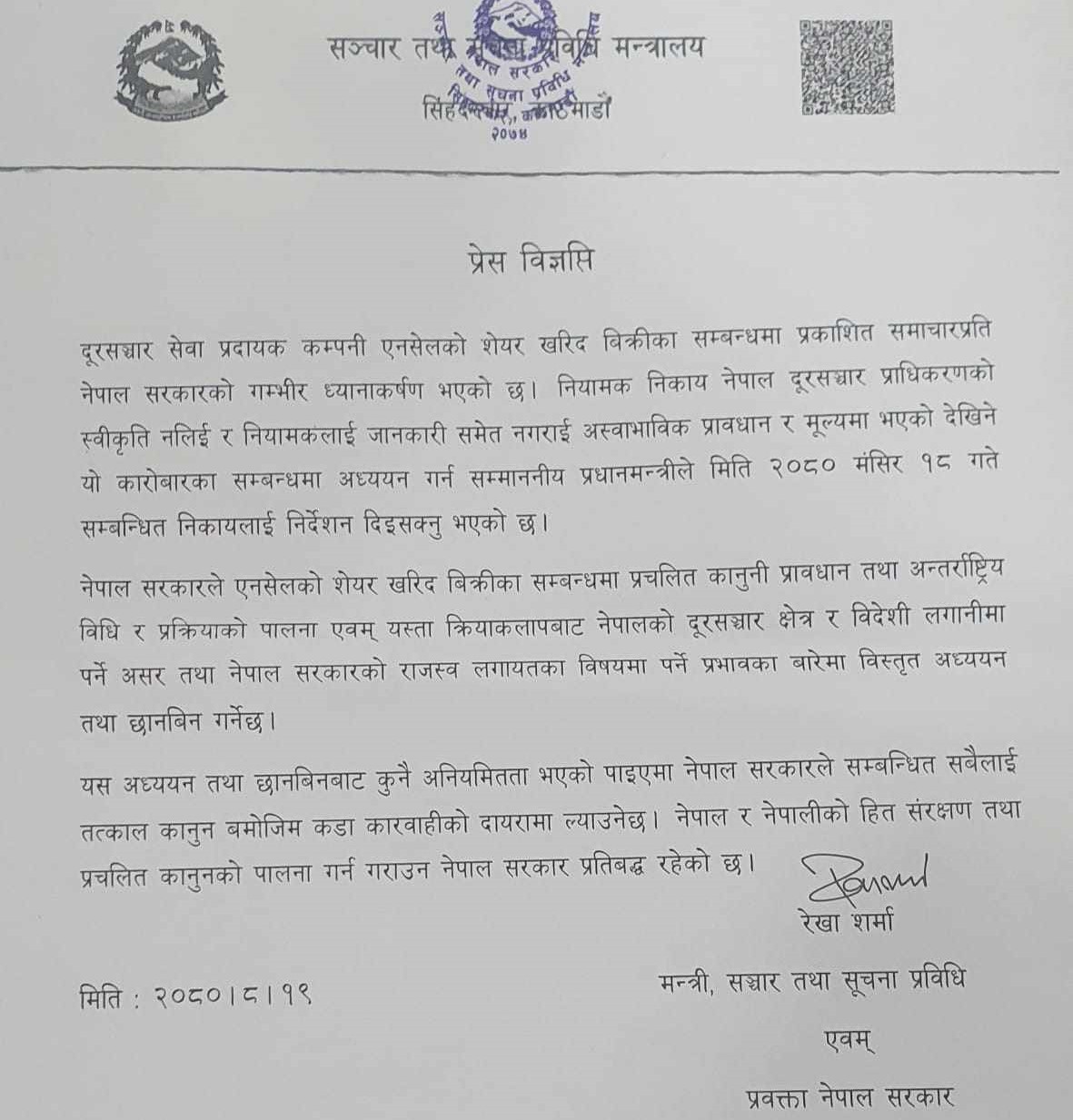 Talking to media persons following the meeting, Minister for Communications and Information Technology and government spokesperson Rekha Sharma said that a high-level investigation committee will be formed at the next cabinet meeting to find out the truth about the Ncell shares' purchase and sale. The government has already decided to conduct necessary investigation regarding the matter, which was supported by leaders of the coalition partners.