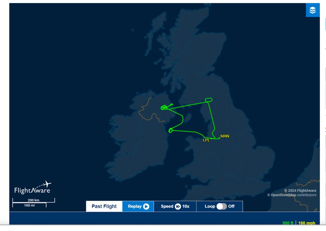 Another Manchester-Dublin flight went back and forth between the UK and Ireland for over three hours, appearing to circle but abandon landing at Dublin, attempting to get on the ground at Belfast (where it made a go-around) and circling over Glasgow before landing in Liverpool – just 31 miles away from the departure airport.