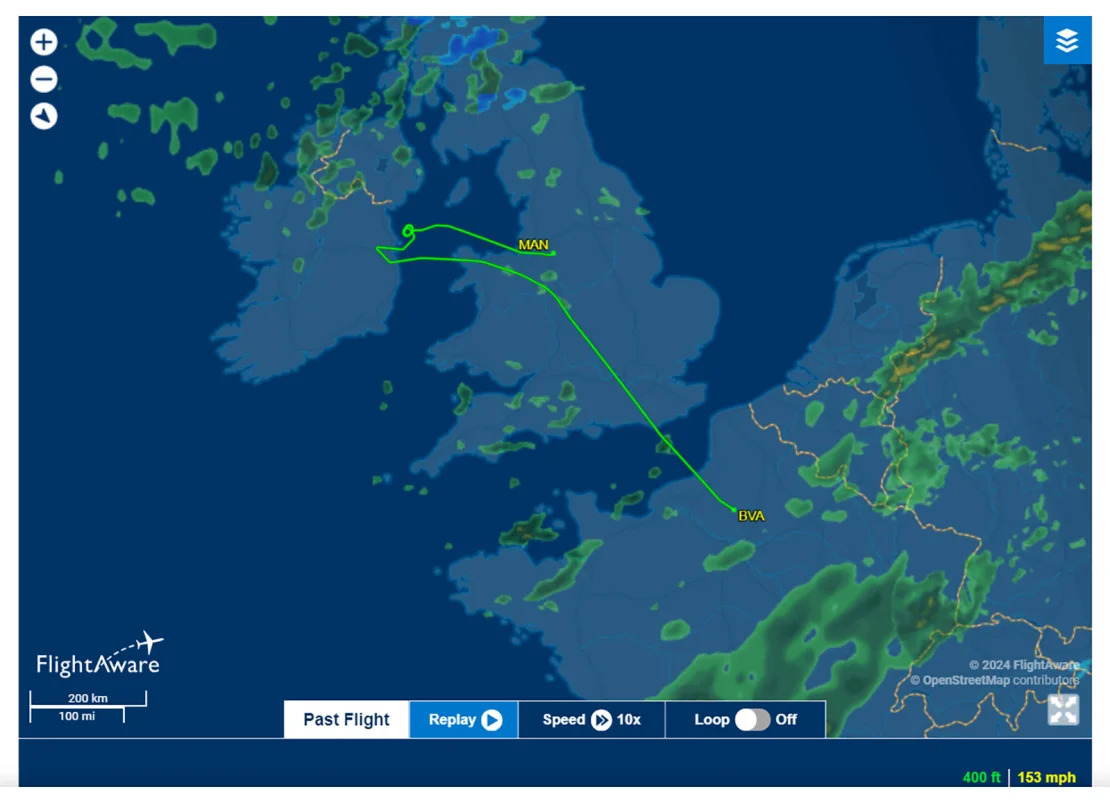 Another Ryanair flight, FR555, was meant to make a quick hop from Manchester to Dublin. After circling nearby in a holding pattern, it attempted to land at Dublin but made a go-around and diverted to Paris Beauvais. What’s usually a half-hour flight became two-and-a-half hours.