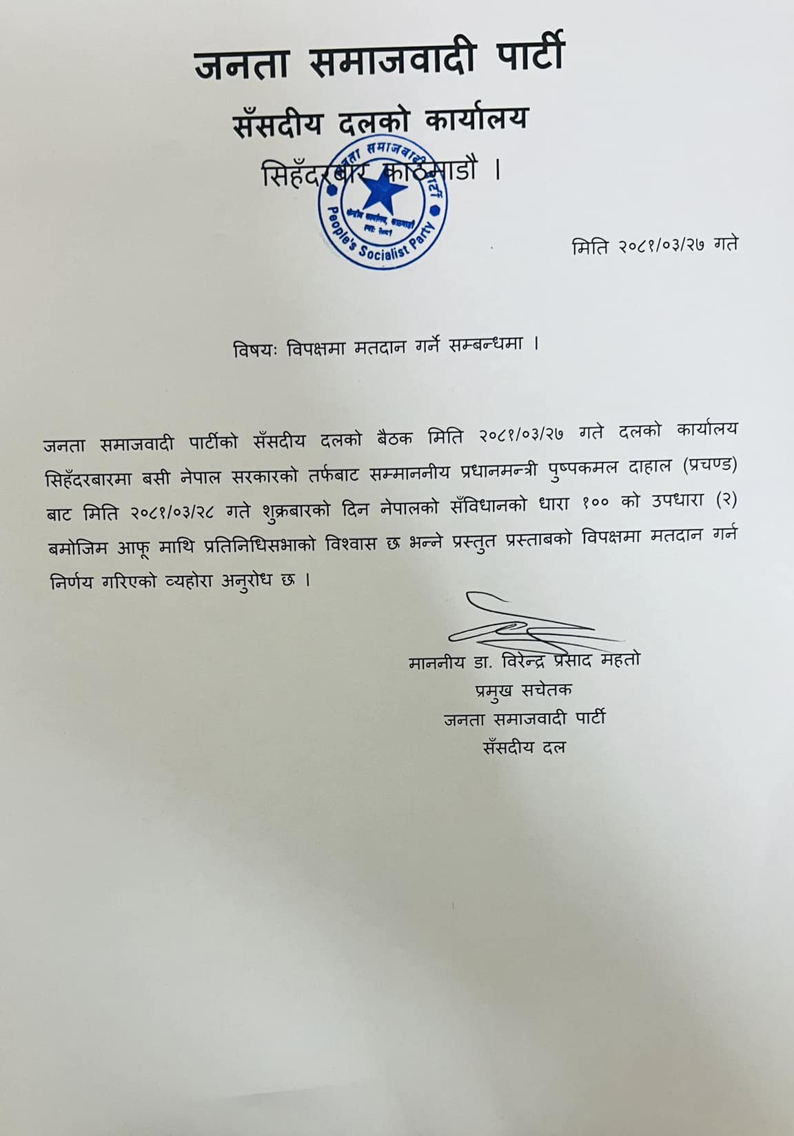 According to Chief Whip of JSP Dr Birendra Prasad Mahato, the meeting of the Parliamentary Party held on Thursday has decided to cast a vote of confidence against PM Prachanda on Friday.