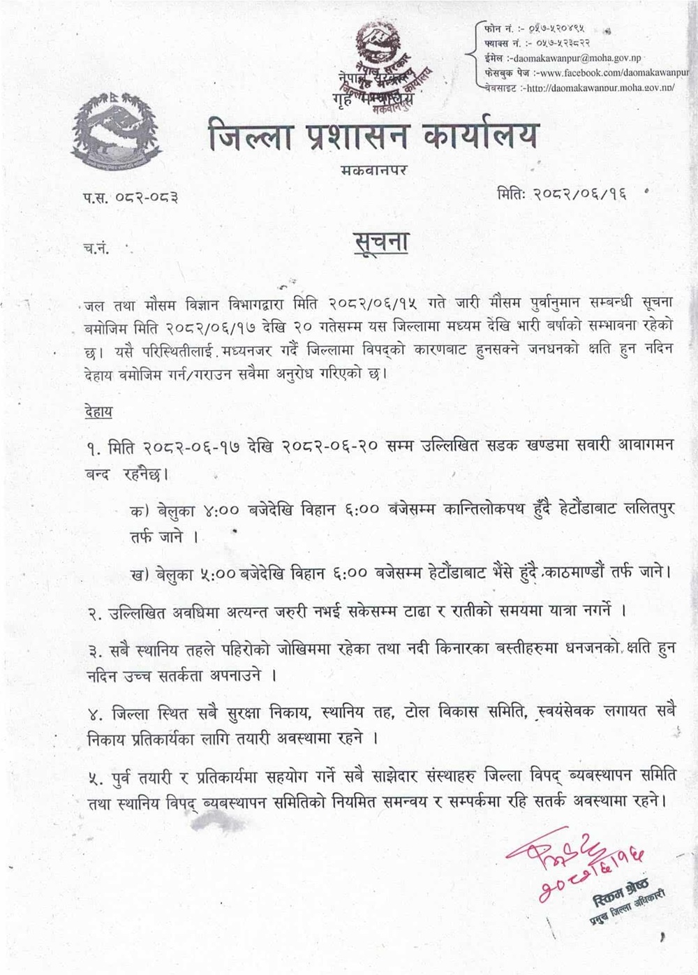 By TRN Online, Kathmandu, Oct 2: The Makawanpur District Administration Office has barred vehicular movement at night in Kanti Highway ( Hetauda-Lalitpur) and Hetauda to Kathmandu through Bhaise.