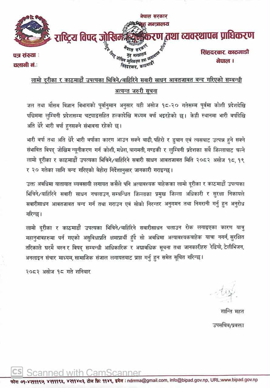 By TRN Online, Kathmandu, Oct 4: Entry and exit of long route vehicles has been restricted from Kathmandu owing to incessant rainfall and possible obstruction of roads by landslides for three days starting today.