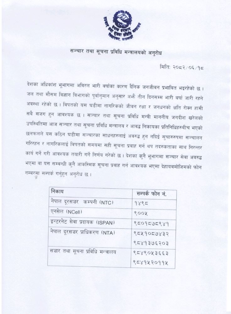 In the meeting held today at the ministry in the presence of the Minister for Communication and Information Technology Jagadish Kharel, all the concerned agencies were requested to get prepared for the challenge of the potential disruption in communication infrastructures amid the heavy rainfall.