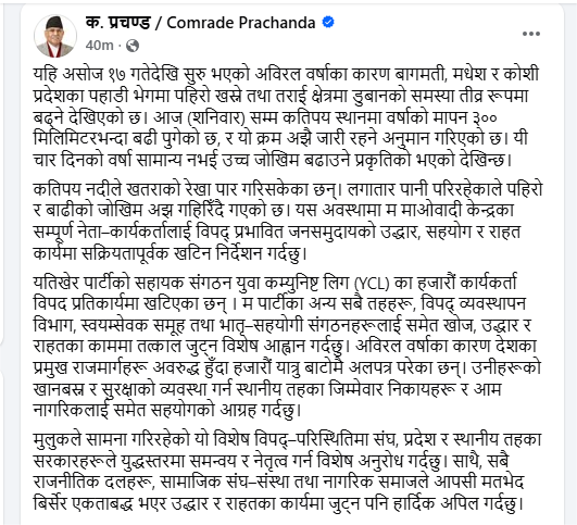 In a statement shared in his social media account, Prachanda, the former Prime Minister, referred to the mobilization of thousands of YCL members for the rescue and relief of the disaster affected and instructed all party members to join hands in the efforts for support, rescue and relief to the people affected by floods, landslides, inundation caused by incessant rainfall.