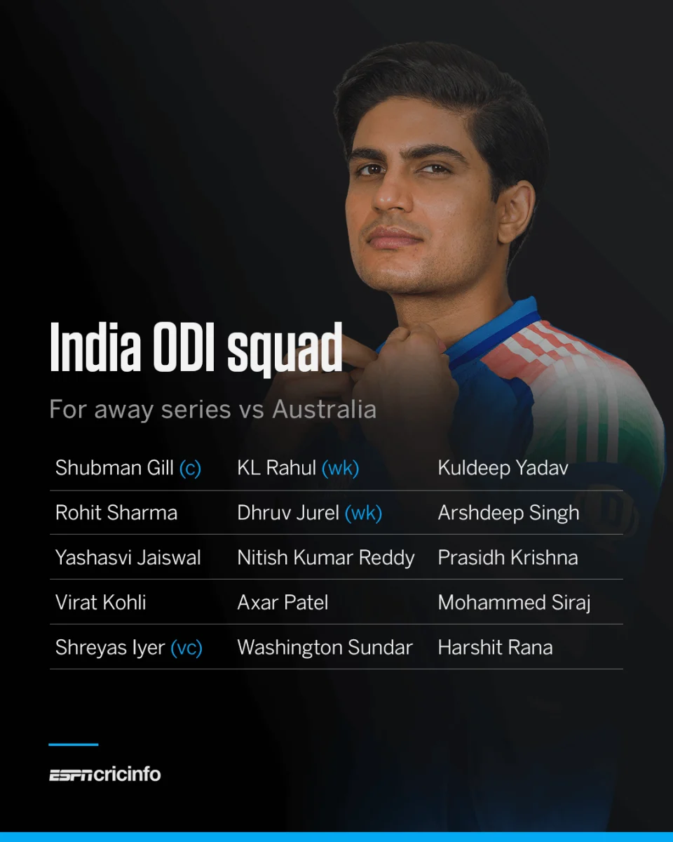 By ESPNcricinfo staff, Oct 5: Shubman Gill has been appointed India's new ODI captain, replacing Rohit Sharma, and will lead the side in the three-match series in Australia starting on October 19.
