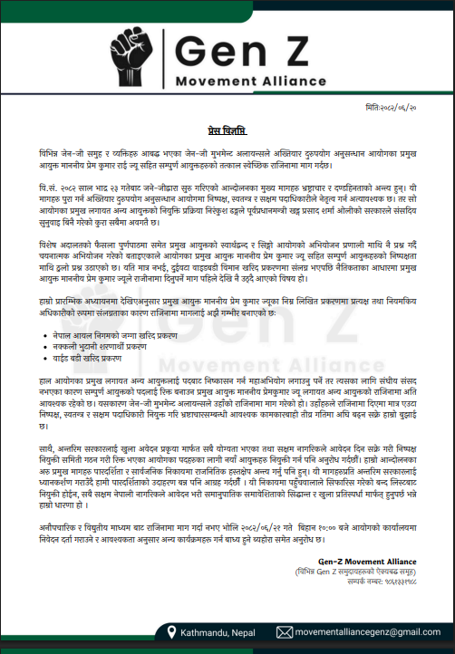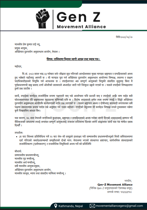 Kathmandu, Oct 7: The Gen Z Movement Alliance has demanded a voluntary