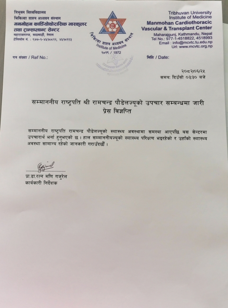 By TRN Online, Kathmandu, Oct 11: President Ramchandra Paudel has been admitted to the Manmohan Cardiothoracic Vascular & Transplant Center, Tribhuvan University Institute of Medicine, Maharajgunj after his health deteriorated.