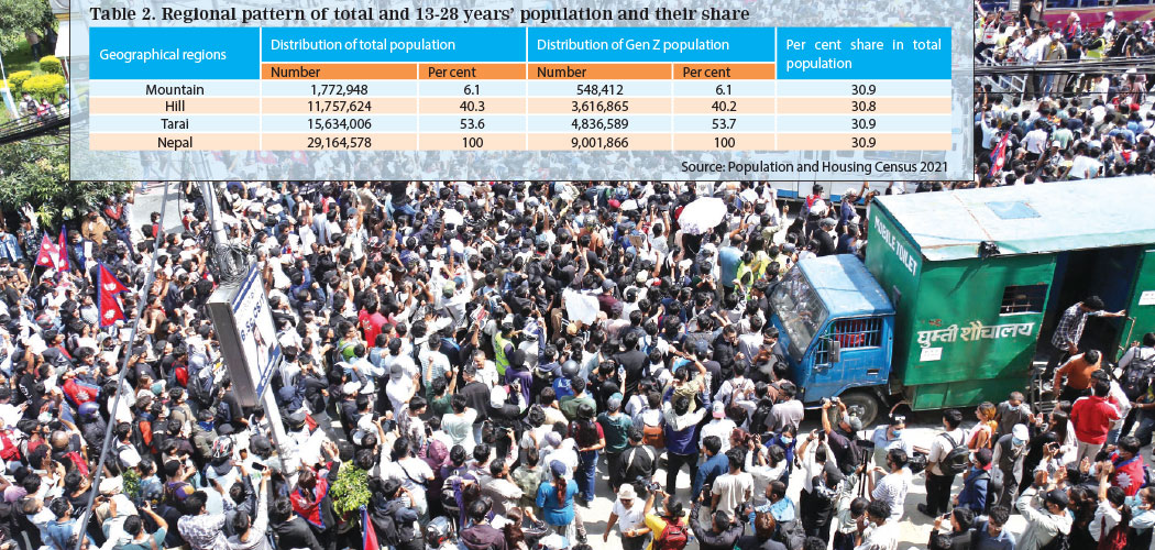 Table 2 provides a regional distribution of Nepal's total and Gen Z populations. It shows that the Tarai region shares the largest proportion, with 53.6 per cent of the total population and 53.7 per cent of the Gen Z population. The Hill region follows with around 40 per cent of both total and Gen Z populations, while the Mountain region accounts for the smallest share, i.e., only 6.1 per cent of each. This proportional alignment indicates that the Gen Z population is distributed across regions almost identically to the total population.