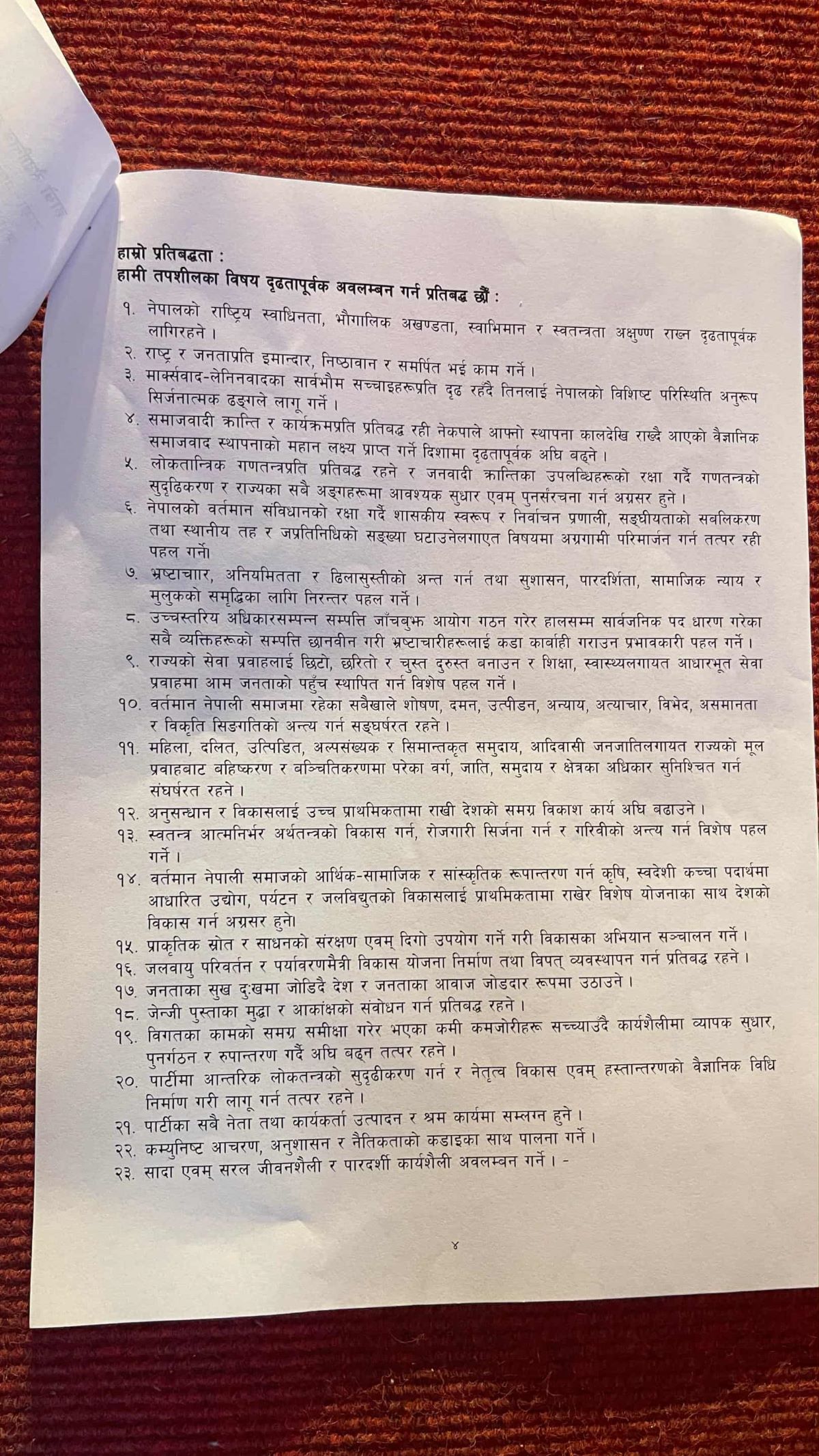By TRN Online, Kathmandu, Nov 5: The Nepali Communist Party has adopted a 23-point commitment paper among which is the commitment to address the issues and aspirations of the Gen Z.