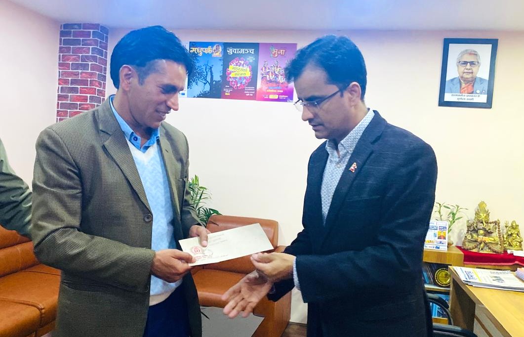 General Manger of the Gorkhapatra Corporation Lal Bahadur Airi (right) handing over the appointment letter to newly appointed online editor Nanda Lal Tiwari.
