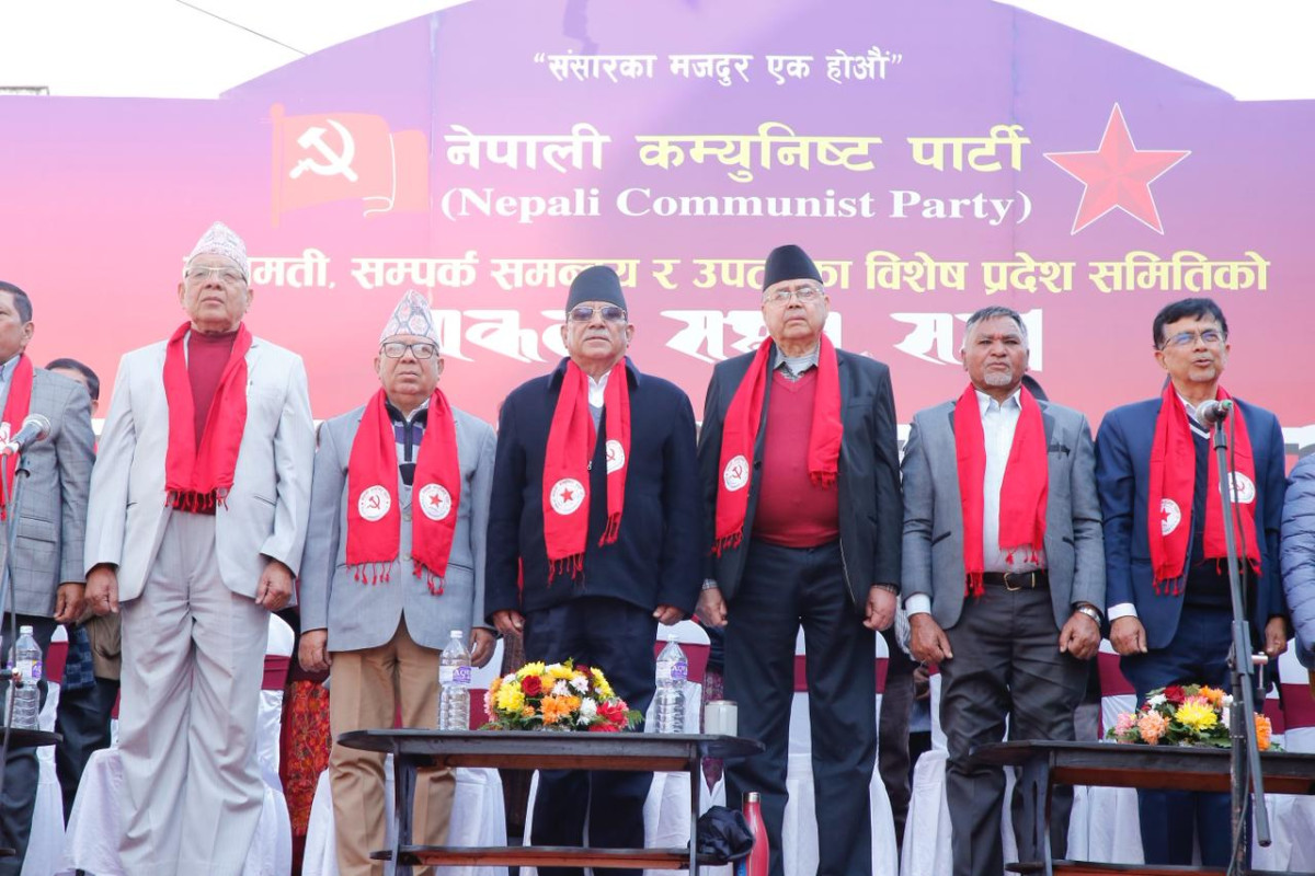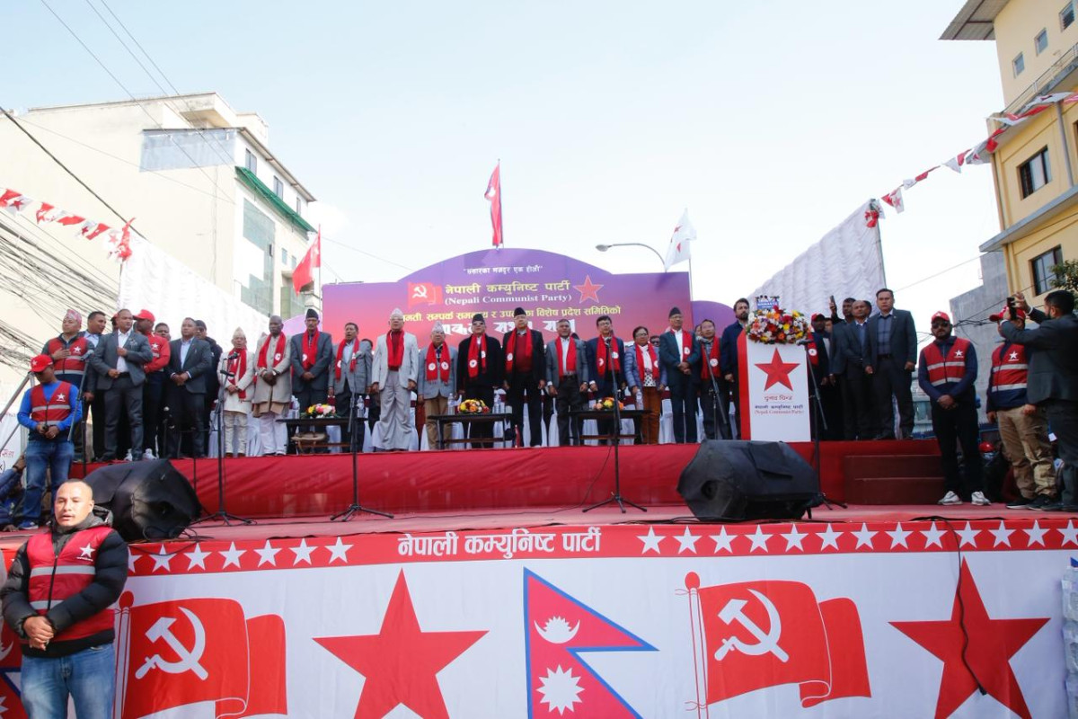 The event is being addressed by the Coordinator of the Nepali Communist Party, Pushpa Kamal Prachanda, Co-coordinator Madhav Kumar Nepal, Jhalanath Khanal, Bamdev Gautam, and Narayan Kaji Shrestha.