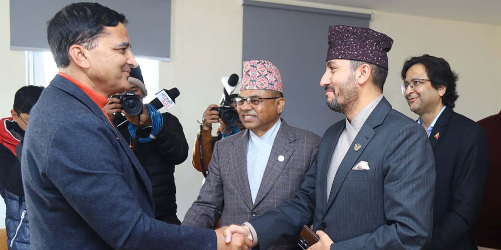 Ministers Kharel and Sinha (right, front) during visit to NC's office at Sanepa, Lalitpur.