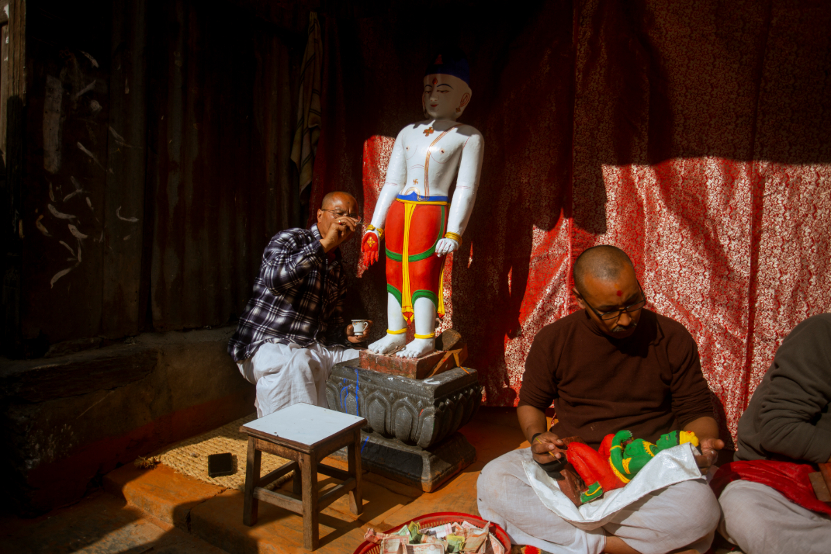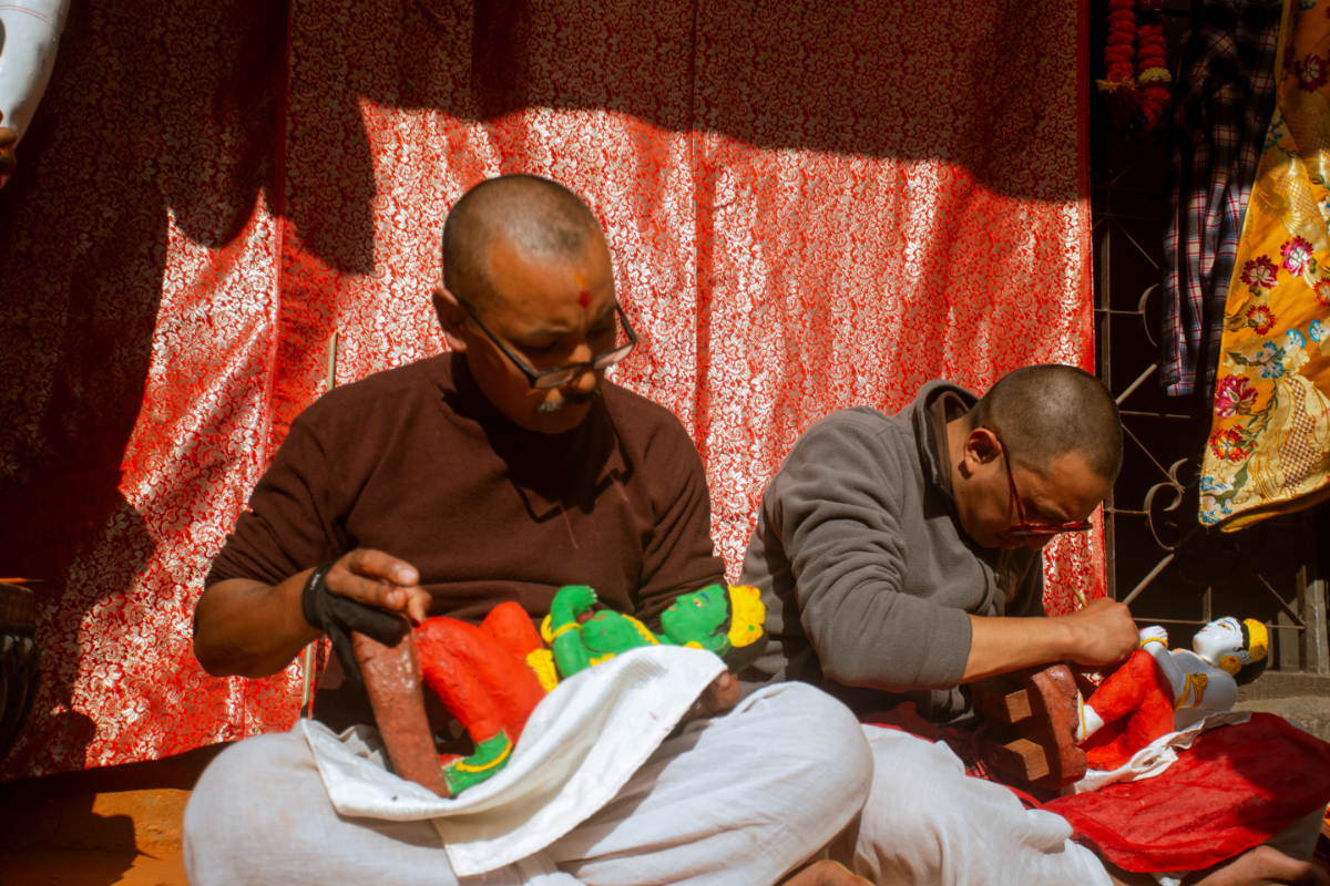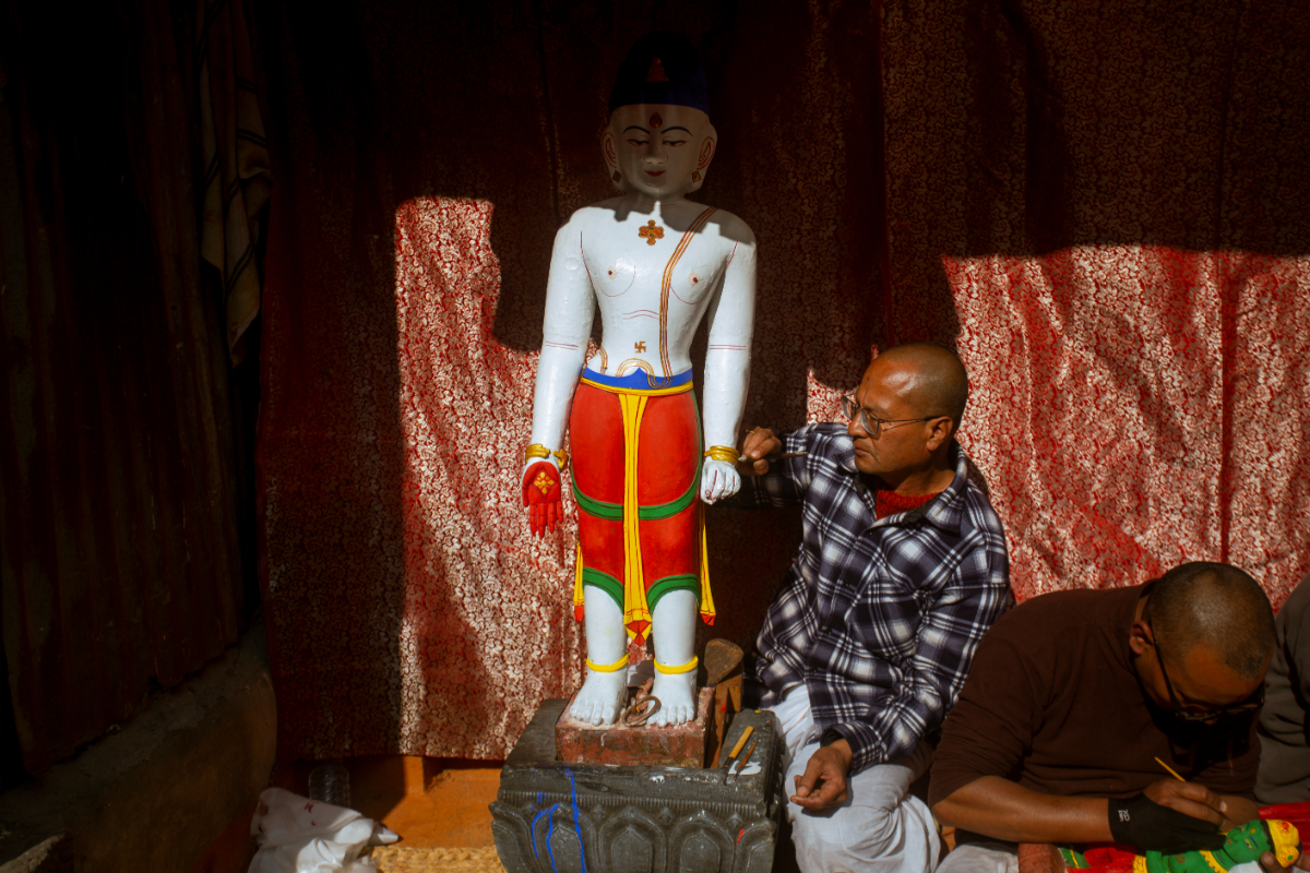 The head priest of the temple is giving a final touch to the sculpture while Narendra Chitrakar is in charge of taking care of the temple.