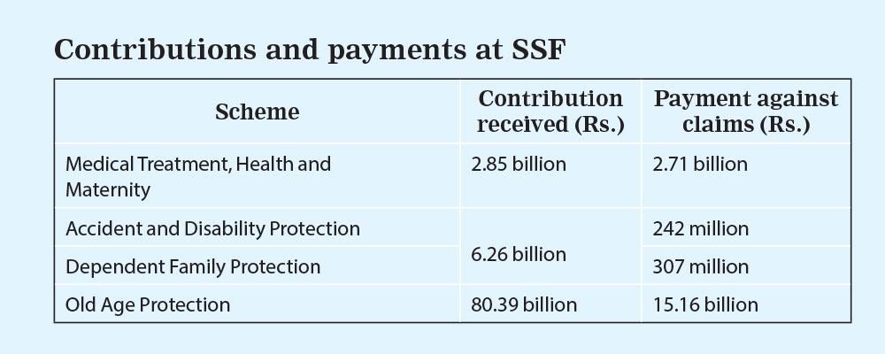 The SSF has collected Rs. 80.39 billion under the old age pension scheme, Rs. 2.85 billion under the medical treatment, health and maternity scheme, and Rs. 6.26 billion under the accident and disability protection and dependent family schemes.