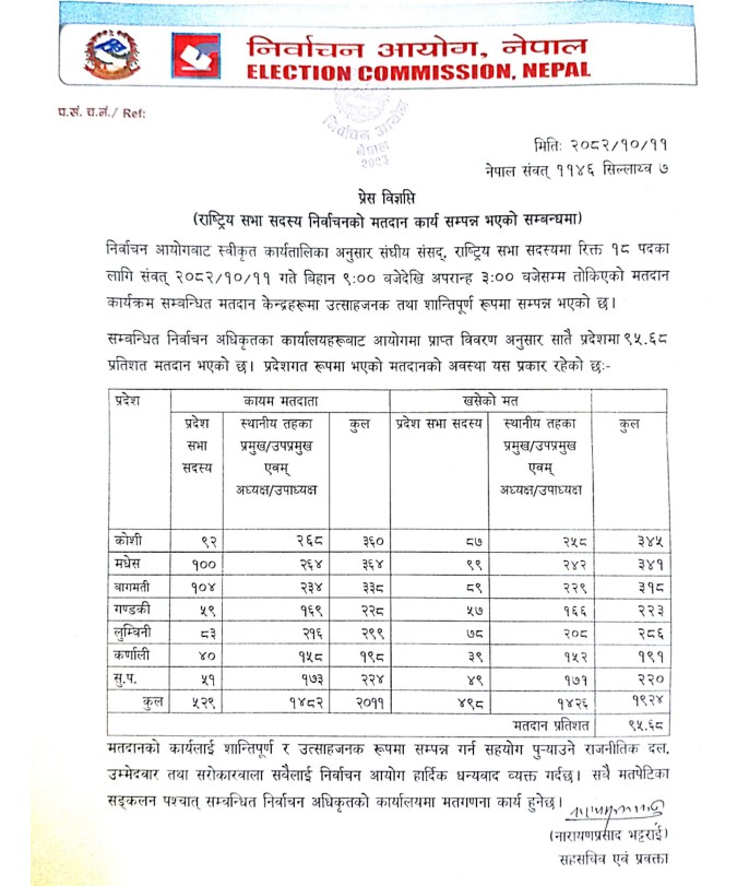 By TRN Online, Kathmandu, Jan 25: The election commission has informed that 95.68 per cent vote has been casted in the election of National Assembly held today.