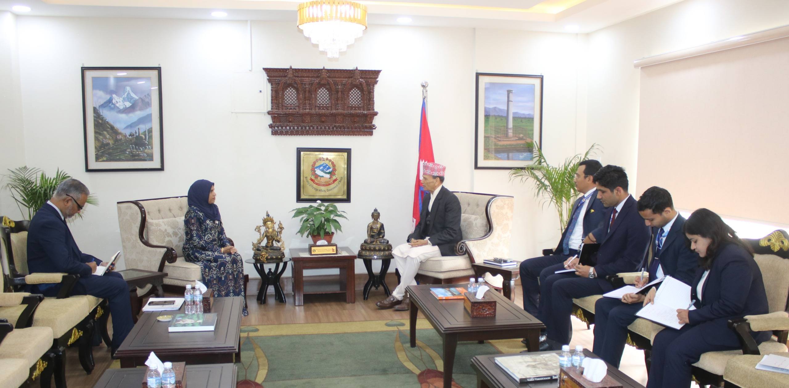 Similarly, Maldivian Ambassador to Nepal, Aishath Azeema, paid a courtesy call on Minister Sharma at the latter's office today itself.