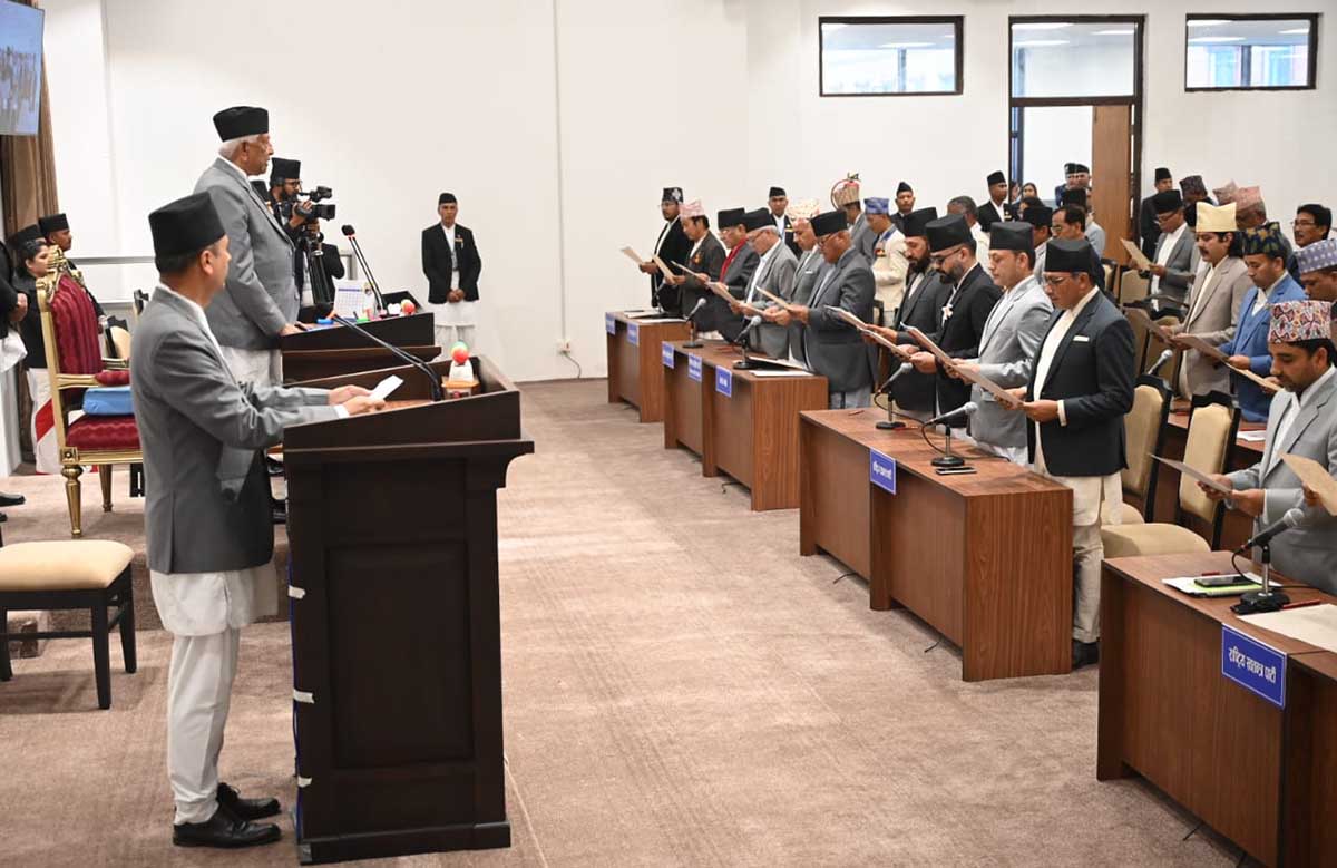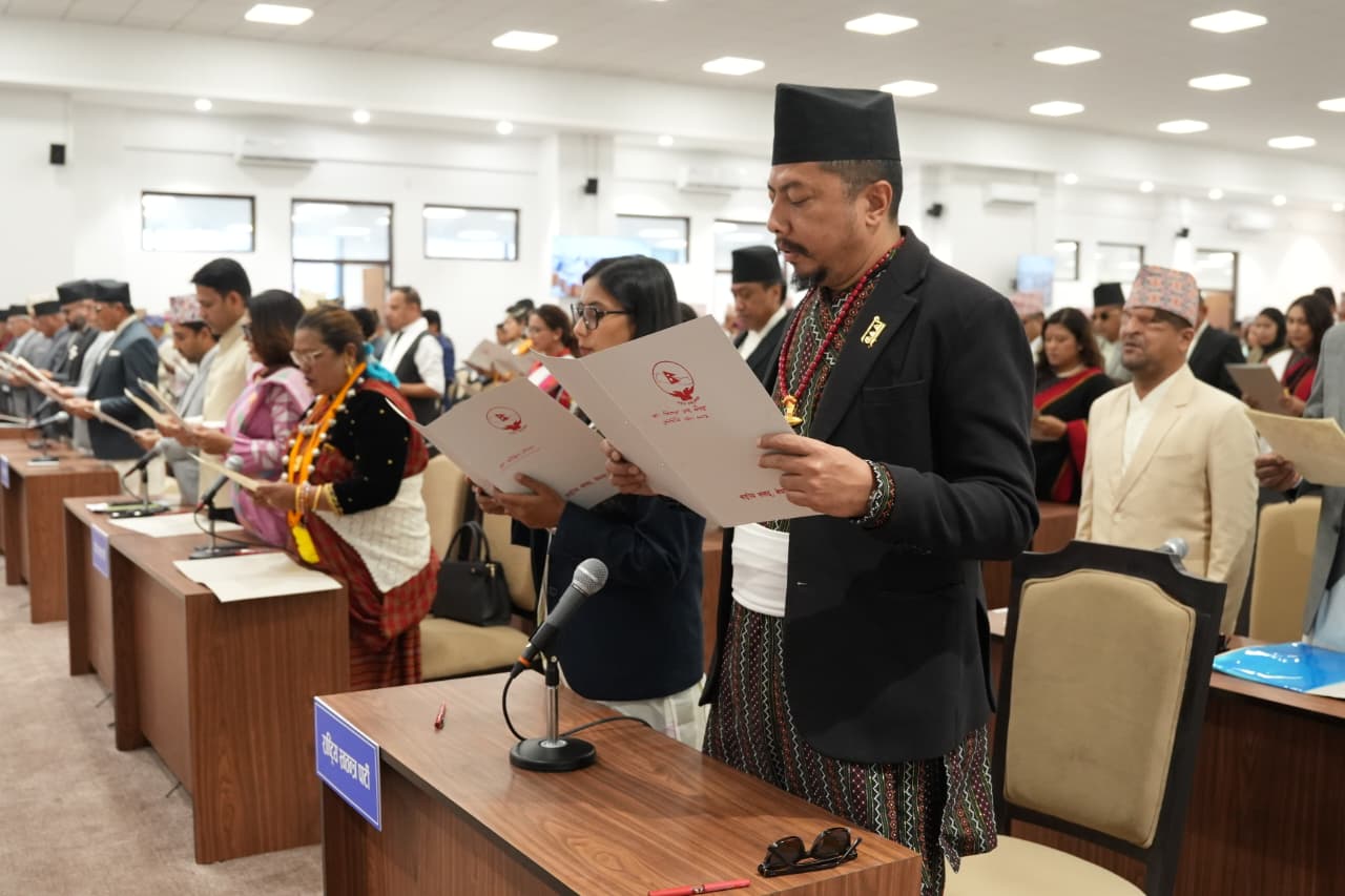 The senior MP Arjun Narasingha KC administered the oath of office and secrecy to the newly elected MP at the newly constructed multi-purpose hall of the federal participant secretariat in Singha Durbar.