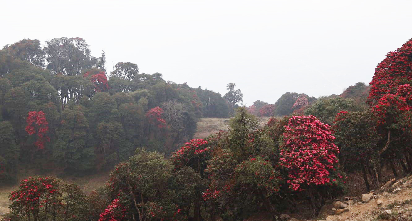 According to Suraj Ojha, chairperson of the Community Forest Users Federation Nepal, Taplejung chapter, rhododendrons have started blooming throughout the TMJ area.