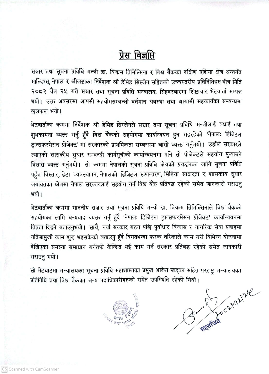 On the occasion, Minister Dr Timilsina expressed gratitude for the support of the World Bank and said that the implementation of the 'Nepal: Digital Transformation Project' would be accelerated.