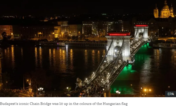Budapest's iconic Chain Bridge was lit up in the colours of the Hungarian flag