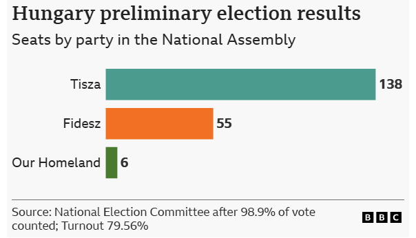 Preliminary election results, based on more than 98% of votes counted, put his Tisza party on course for an extraordinary 138 seats, with Orbán's Fidesz on 55 and the far-right Our Homeland on six.