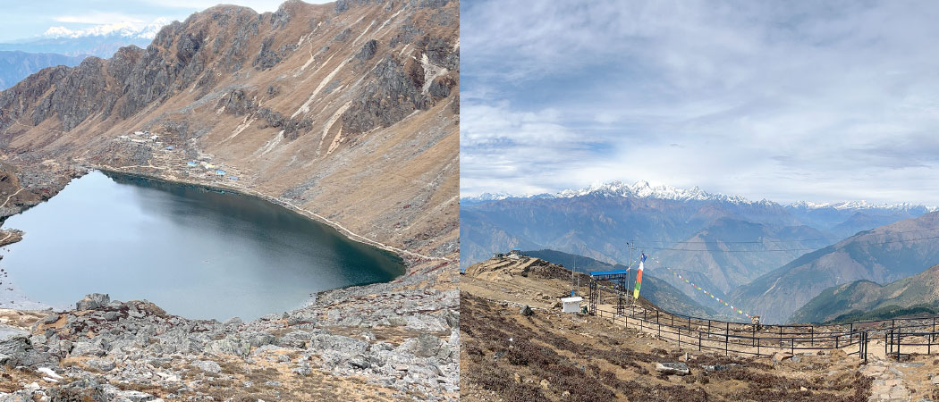 The sunrise the next morning turned out to be another attraction. Additionally, witnessing the beauty of the peaks of Gonzala, Yala, Shishapangma, Lakpa Dorje, Jugal, and Gaurishankar mountains—standing in a row from north to east and painted with the crimson glow of the rising sun—refreshed our minds and souls. While enjoying the beauty of Kutumsang, we began our trek toward Gosainkunda at around 8 am.