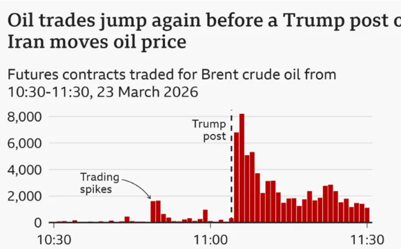 A bar chart and a line chart titled " Oil trades jump again before a Trump post on Iran moves oil prices”, showing trading volumes, and the price per barrel, for Brent crude oil futures on the morning of Monday 23 March 2026. The bar chart of trading volumes shows Brent futures contracts were trading at a volume of 41, at 10:30 GMT (each contract represents 1,000 barrels of oil). That stayed in double figures or the low hundreds until 10:49, when it jumped to 1,619. It fell back, and then jumped much higher to a peak of 8,205 at 11:06, shortly after Trump posted about Iran. It then gradually fell back lower. The line chart of prices shows Brent futures were trading at a little under $113 a barrel at 10:30, but then dropped sharply after Trump’s interview was made public, hitting $97 by 11:08, before recovering slightly to $104 by 11:30. The source is Bloomberg.