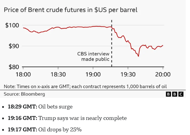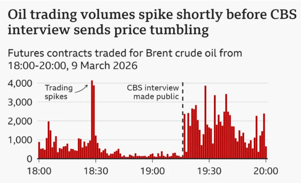 A bar chart and a line chart titled "Oil trading volumes spike shortly before CBS interview sends price tumbling”, showing trading volumes, and the price per barrel, for Brent crude oil futures on the evening of Monday 9 March 2026. The bar chart of trading volumes shows Brent futures contracts were trading at a volume of 884, at 18:00 GMT (each contract represents 1,000 barrels of oil). That spiked to 4,141 at 18:28, fell again, and then rose sharply again shortly after 19:16, when an interview on CBS was made public, in which Trump indicated the Iran war could be near an end. The line chart of prices shows Brent futures were trading at a little under $100 a barrel at 18:00, but then dropped sharply after Trump’s interview was made public, hitting $85 by 19:39, before recovering slightly to $90 by 20:00. The source is Bloomberg.