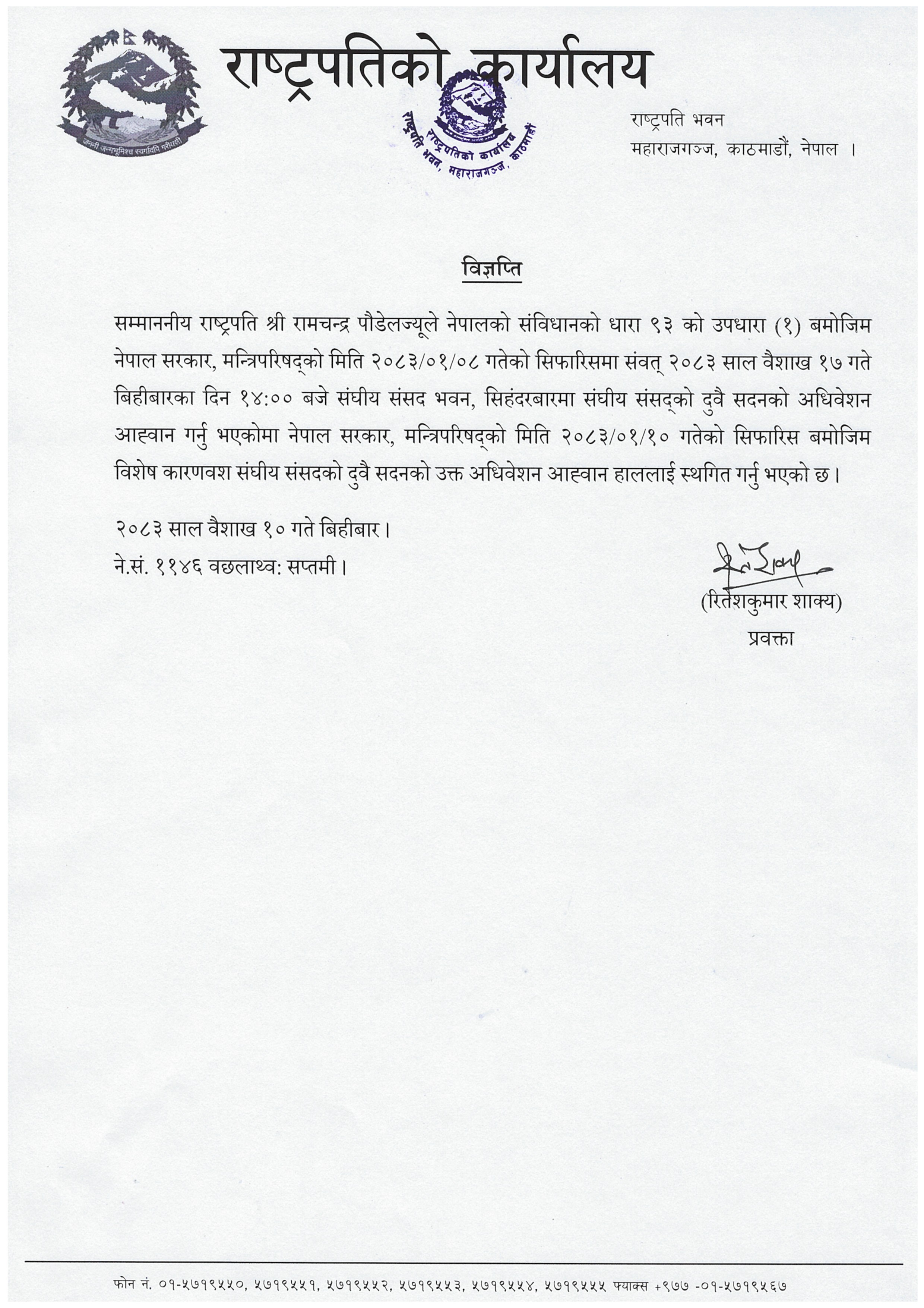 According to the Spokesperson of the Office of the President, Ritesh Kumar Shakya, the President has suspended the session of the federal parliament, citing special reasons on the recommendation of the government of Nepal and the Council of Ministers.