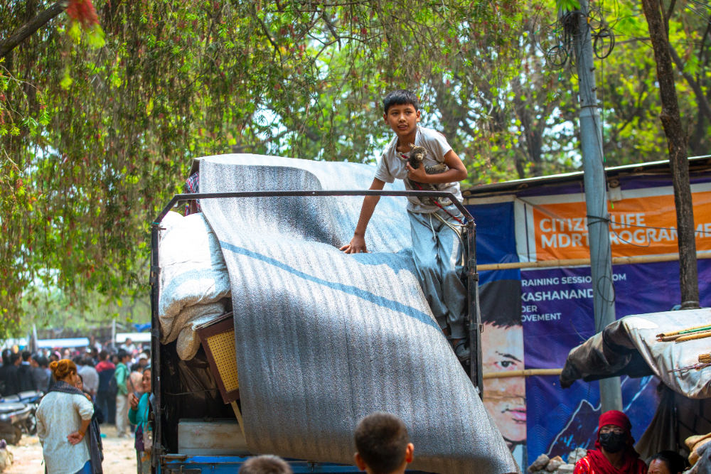 loading sheets, wooden planks, and kitchen items onto tractors and rickshaws.